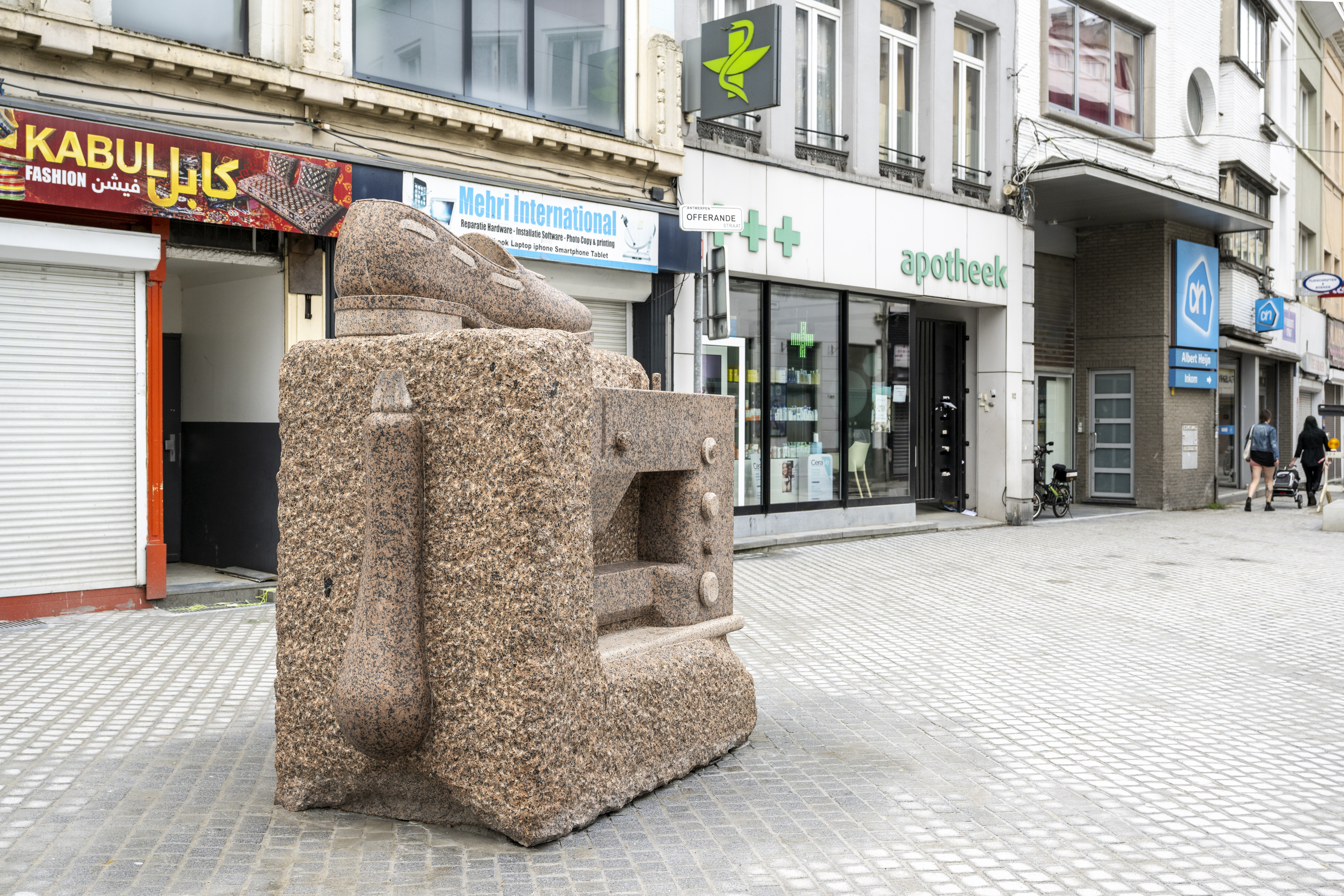 Granieten rots met courgette, naaimachine en loafer met kwastjes werd gemaakt in opdracht van district Antwerpen, onder begeleiding van Kunst in de Stad - Middelheimmuseum.